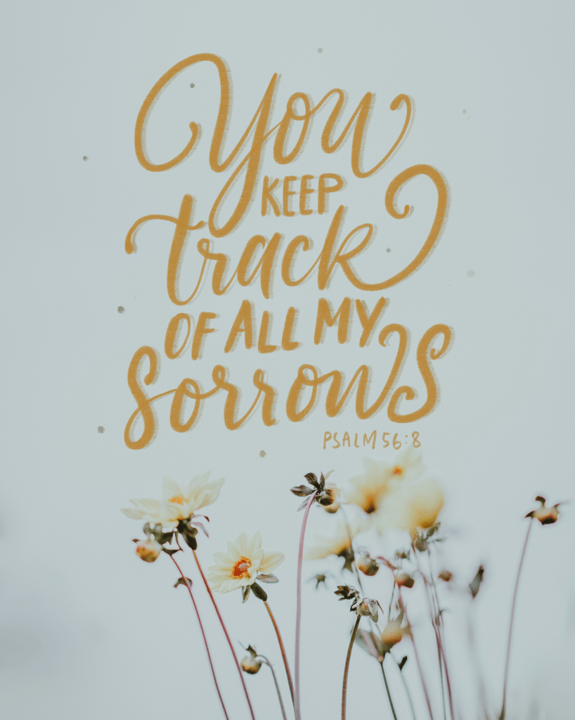 “You keep track of all my sorrows. You have collected all my tears in your bottle. You have recorded each one in your book.” Psalm 56:8
